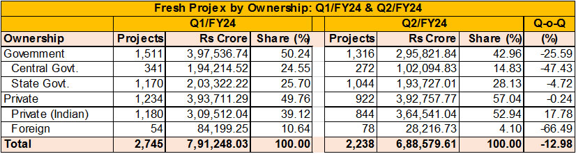 In all, 2,238 new projects with an aggregate investment intention of Rs 6,88,579.61 crore were announced in Q2/FY24 as against 2,745 new projects worth Rs 7,91,248 crore announced in the preceding quarter, indicating a fall of 12.98 percent in terms of aggregate investment and a fall of 18.47 percent in terms of number of new projects.